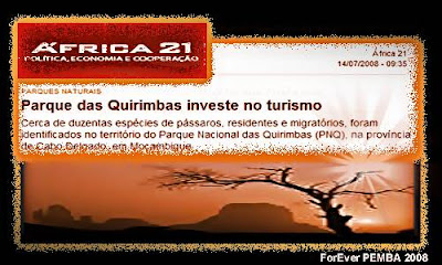 E acrescento - É JPT! Bem reportado… Está na hora de dar um basta nessa falsa onda de progresso que levará inevitávelmente à destruição dos últimos redutos ecológicos que ainda sobrevivem neste decadente planeta. Aqui “de longe” já venho observando essa verdadeira e demente estupidez que também ocorre em Cabo Delgado faz algum tempo…e até me atrevi a “denunciar” no ForEver PEMBA, alertado pelas imagens fotográficas que recebo da “apesar de tudo” sempre bela e estimada Pemba. Mas parece-me que o alheamento generalizado da população simples, como a “ganância” pura, egoísta, vaidosa de determinados empresários e também de cidadãos mais “abonados” dessa região, desvinculada de qualquer preceito ecológico, torna-os convenientemente cegos, preocupados mais com o saldo crescente de suas poupanças bancárias e seus privilégios do que com o próprio País Moçambique e os cuidados que a cidade precisa e merece. Estes - Moçambique e Pemba - que se danem! E “cada um por si”…como se usa dizer por aqui.