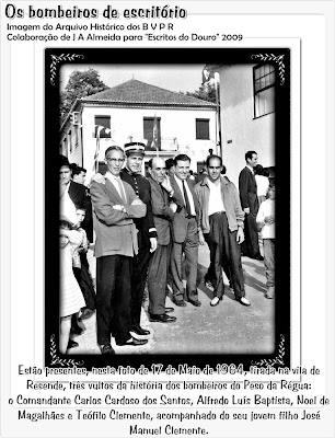 Estão presentes, nesta foto de 17 de Maio de 1964, tirada na vila de Resende, três vultos da história dos bombeiros do Peso da Régua: o Comandante Carlos Cardoso dos Santos, Alfredo Luís Baptista, Noel de Magalhães e Teófilo Clemente, acompanhado do seu jovem filho José Manuel Clemente, que estavam a convite da associação humanitária local para assistirem a uma cerimónia de homenagem aos bombeiros.