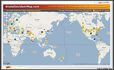 Sugerido por Amigo de Pemba tomei conhecimento do "GlobalIncidenteMap.com". Quando você clica no link aparece um website com um mapa-mundi que indica e detalha o que de estranho e perigoso está a acontecer, momento a momento em todos os países do mundo. É atualizado automáticamente a cada 310 segundos. E você ainda pode, utilizando o mouse (rato) e clicando no "incidente" escolhido, aperceber-se dos pormenores e da história do que está acontecendo, entre outras informações que o portal oferece sempre relativas à lamentável e crescente violência que vem assolando nosso planeta.