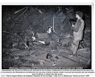 Em plena acção vê-se um bombeiro de Peso da Régua. De archote na mão, outra marca da ausência de meios apropriados à situação de socorro, aliás, tal como o tipo de fardamento (fato-macaco e calçado normal), prescruta entre os destroços do que foi a povoação de Riobom, freguesia de Cambres, com a intenção de ainda salvar vidas e bens, sob o olhar de um popular que parece procurar algo.
